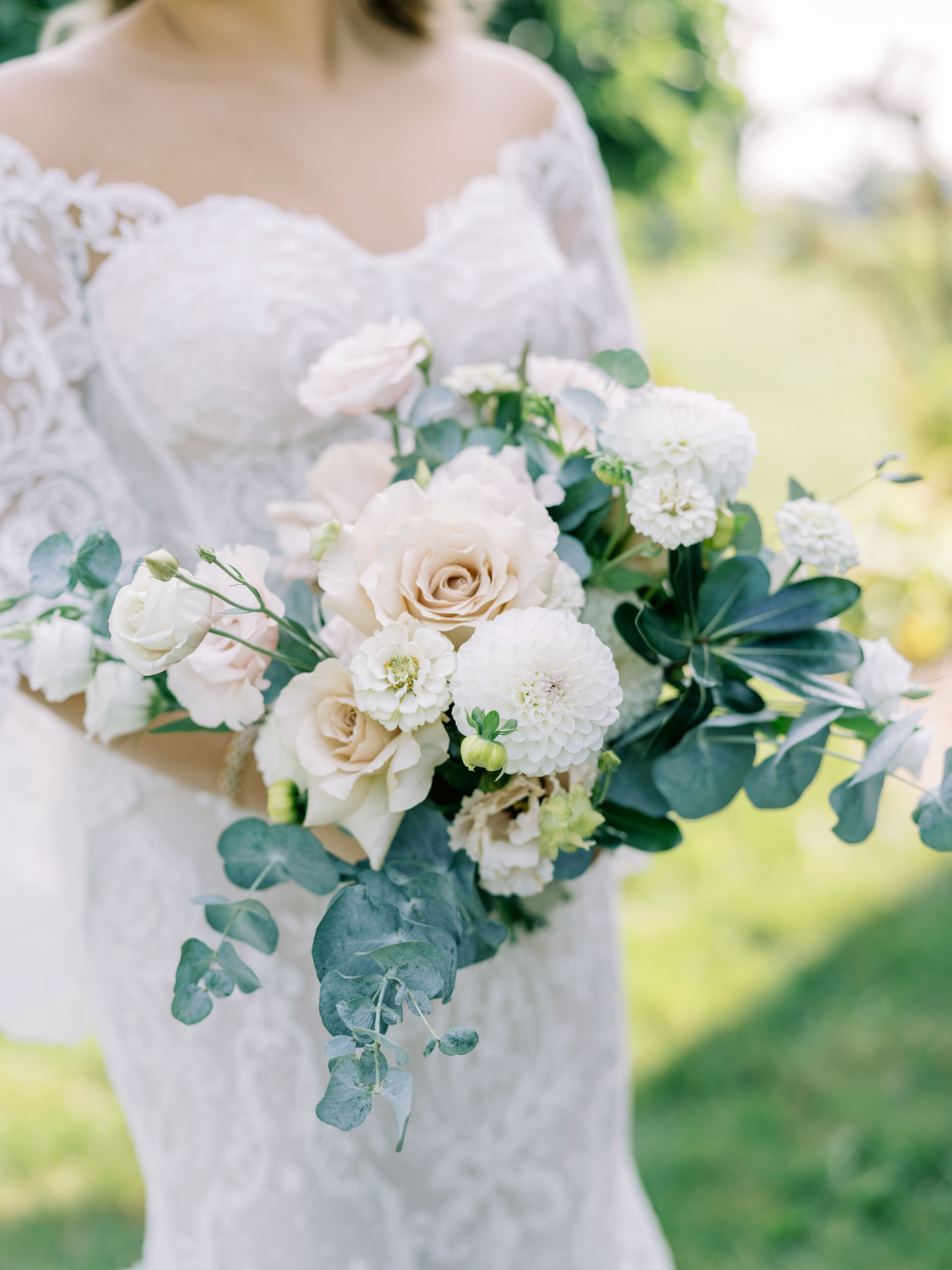Their sweet and sentimental ceremony was officiated by a one of Samantha's family members. After their ceremony, Samantha and Mike decided to spend a few minutes alone together and each grabbed a cocktail to enjoy during a walk among the orchards as their guests started to enjoy cocktail hour. Lawn games like corn hole and Jenga were set up for their guests to play during cocktail hour. Their dog Diggs, made an appearance on their cocktail napkins and with their signature drinks served at cocktail hour. The signature drinks were also each topped with a little acrylic monogram of their initials.