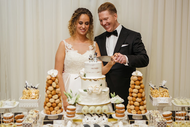 The Reception followed back at Queen's Landing in the Grand Georgian Ballroom. The guest tables were beautiful designed with personalized menu wrapped napkins, black and gold flatware, gold beaded glass charger plates and centrepieces that were designed within personalized black and gold boxes with their names and wedding date on them. They sat together at a lovely sweetheart table set beneath an arch covered in greenery. After Dinner, guests got to enjoy an amazing sweets table and dance the night away to the sounds of a live band.